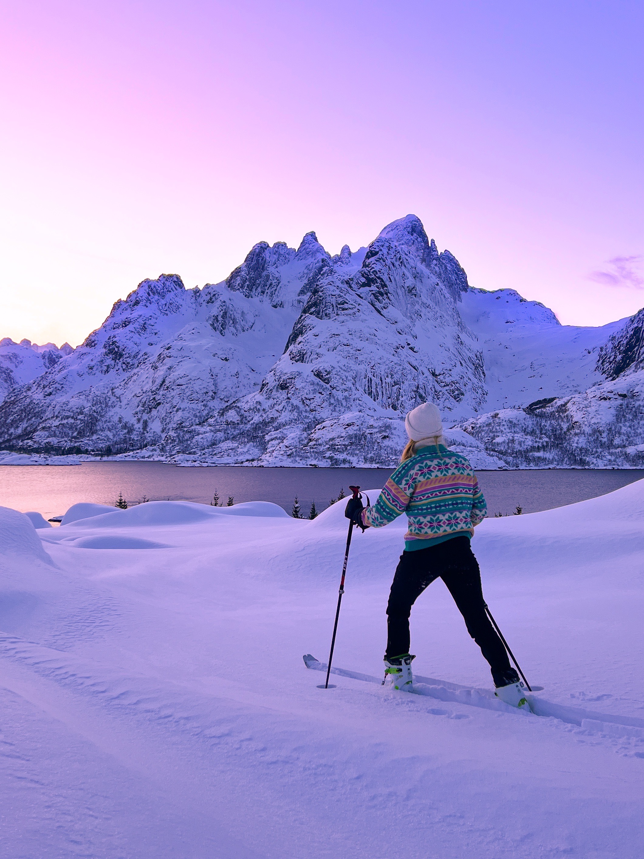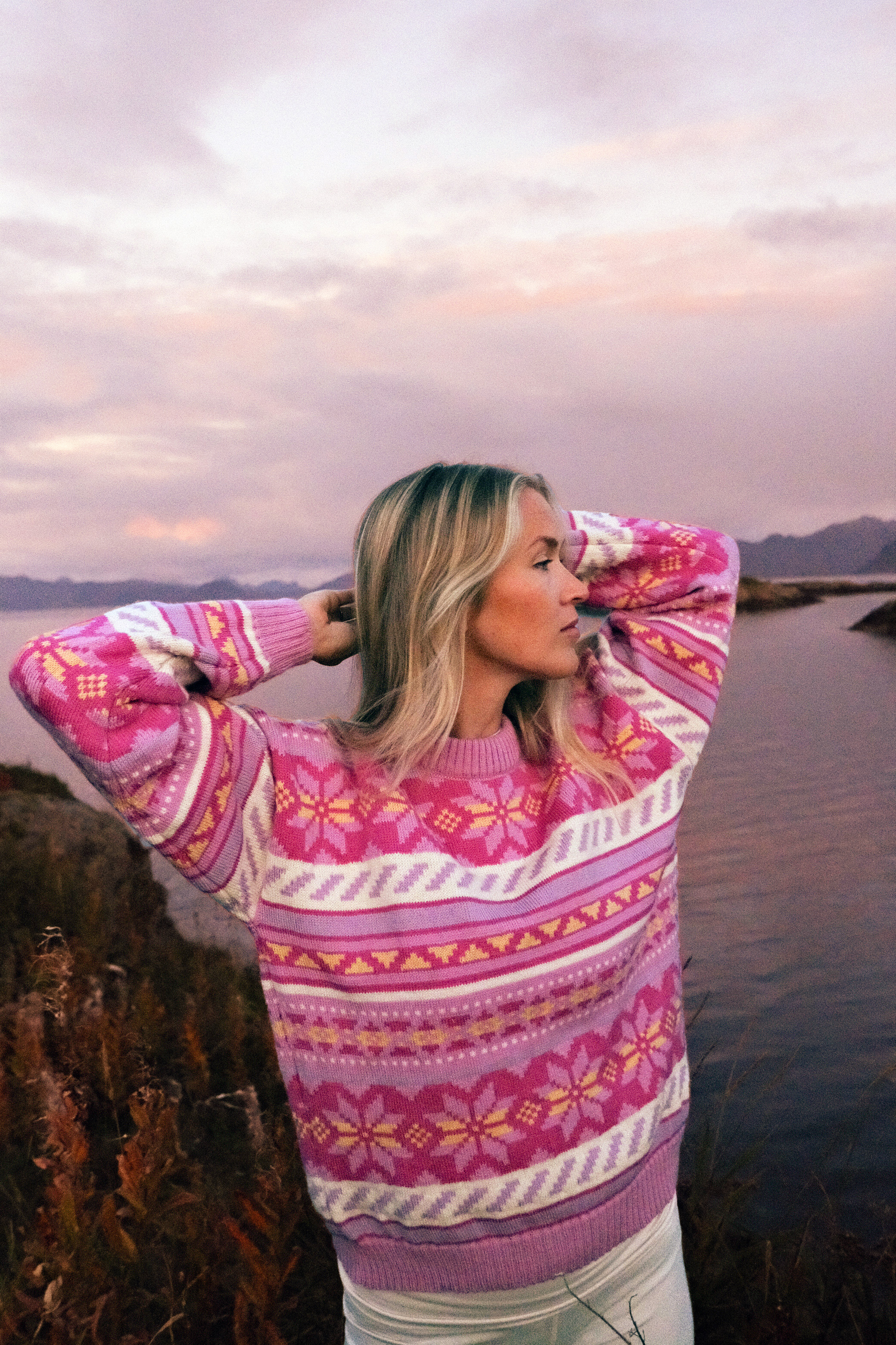 Dale of Norway and Ingrid Raadim Hennig are now launching this season’s colorful Ingrid Sweater! This is the third sweater in the ongoing collaboration, and once again, Ingrid has designed a piece that captures the essence of the North. Inspired by the magical sunsets hues in Lofoten, the color palette reflects a beautiful blend of pink, purple, and hints of yellow—a tribute to the spectacular light Ingrid loves.