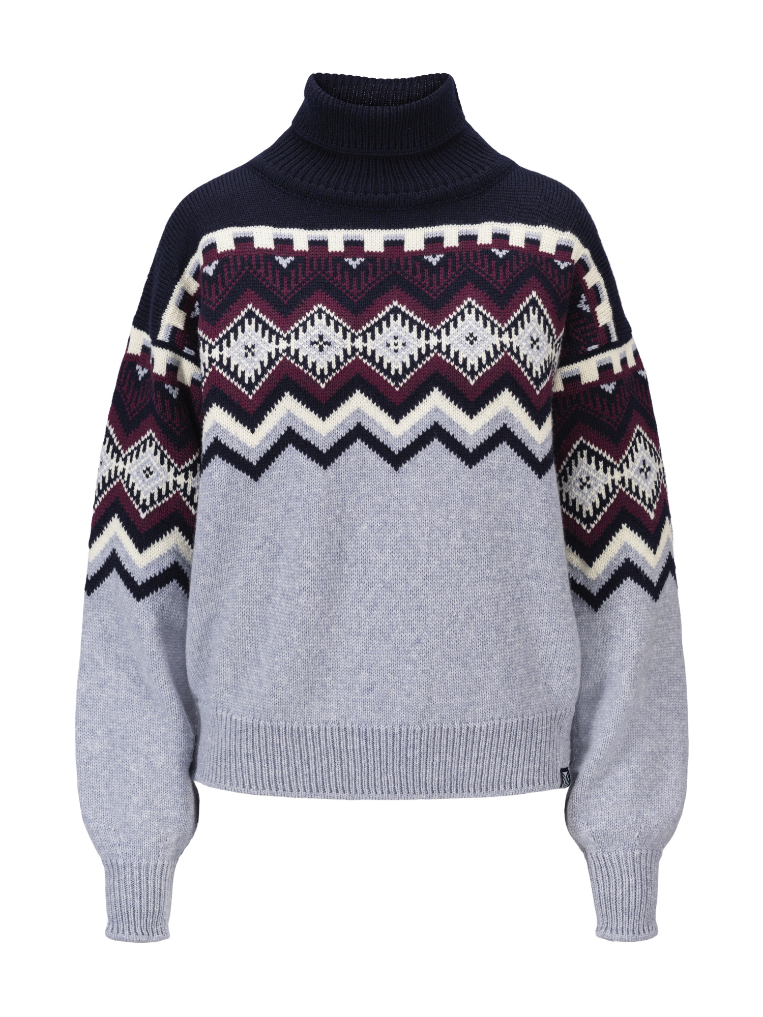 A super-soft merino sweater featuring a comfortable high neck and intricate pattern details in a mix of contrasting colors. The sweater is slightly cropped, with voluminous sleeves and a relaxed fit. It has chunky ribbed finishes at the cuffs, neckline, and bottom hem. Inspired by classic ski sweaters, the pattern is a reimagined version of our bestselling Vilja sweater.