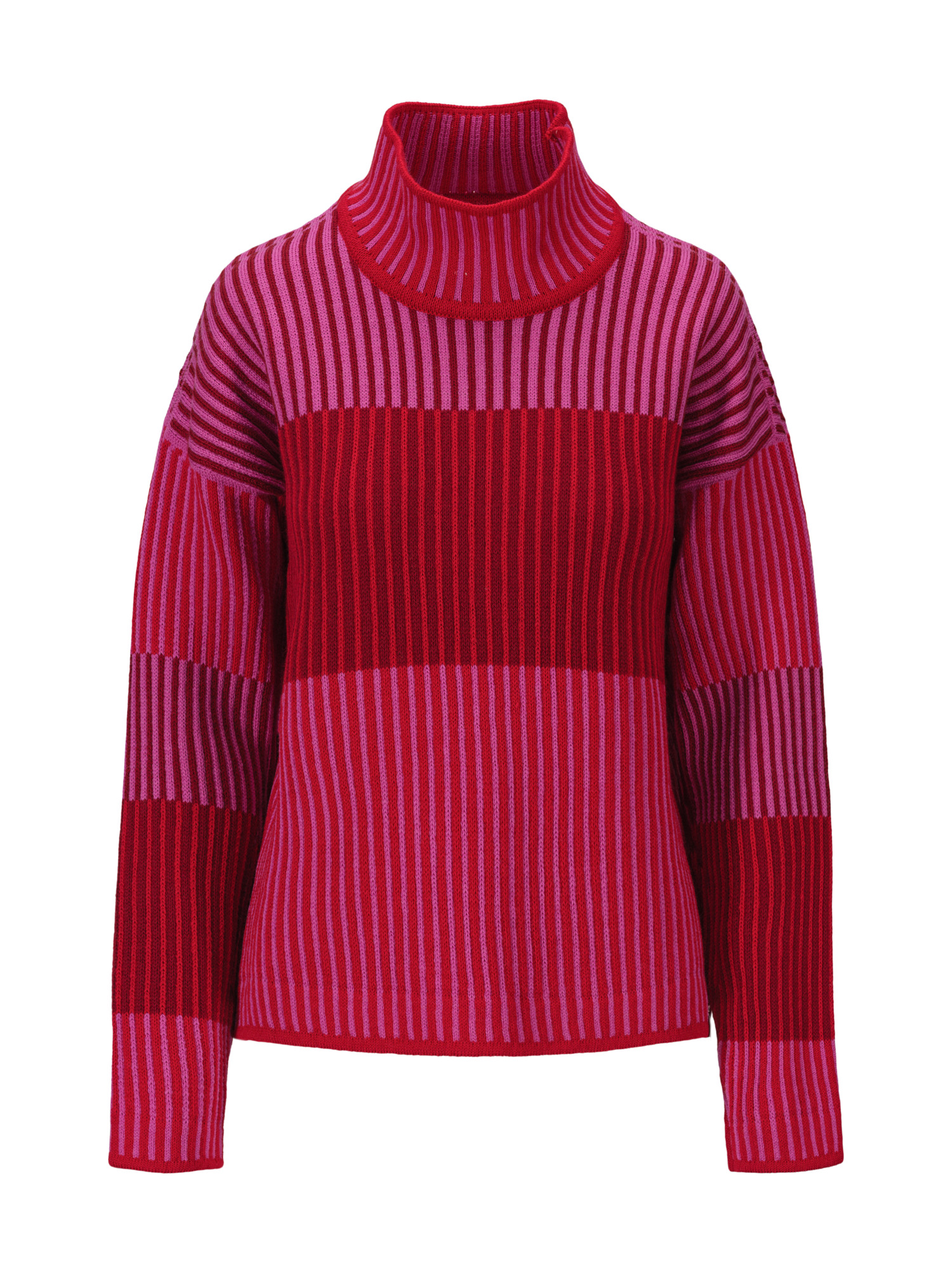 • A playful sweater with a relaxed, dropped shoulder giving a wide fit. The sweater is knitted in a tonal palette and a structured effect giving a rib look-a-like. Despite the split look, the front, back and sleeves of the sweater are knitted as whole pieces. The high neck is single knitted with a wide shape for comfort and room.